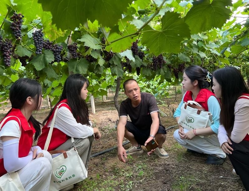 四、耕耘有獲“葡”新篇,電商助農“播”希望 一藤一蔓承載耕耘希望,一屏一線連通致富橋梁。依托得天獨厚的自然生態資源,齊躍橋村以綠色農業為基底,創新打造“農業+旅游”的融合發展模式。在葡萄產業園,負責人吳再彬為實踐團成員詳細講解了現代化葡萄種植技術、園區管理模式及多元銷售渠道。成員們通過親手修剪葡萄藤、參與果實采摘等實踐活動,深刻體會到“耕耘有獲,勞作有為”的農耕精神。“采摘的不僅是飽滿的果實,更是感受到了農旅融合帶來的產業新活力。”實踐團成員劉欣感慨道。