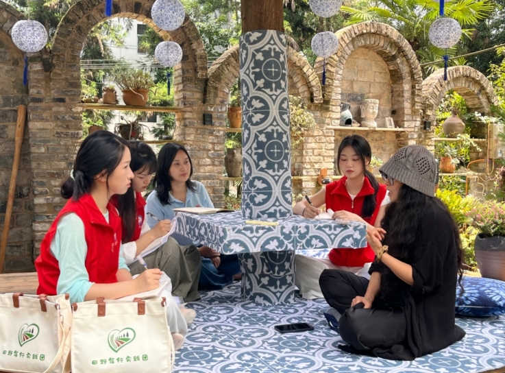 三、非遺點“染”民宿經濟,青春助力文旅發展 一扎一染傳承千年匠心,一布一藝激活鄉村經濟。近年來,齊躍橋村立足“農旅融合+后工業文化”發展模式,以民宿產業為引擎,推動非遺文化與鄉村旅游深度融合。在齊躍橋村,非遺扎染的藍白紋樣不僅躍上布匹,更“染”活了鄉村文旅產業。實踐團成員在民宿老板許丹的指導下體驗扎結、浸染等傳統工藝,制作出獨一無二的藍白紋樣作品。實踐團成員陳曉雨在體驗后感慨:“一扎一染間,我們不僅領略了傳統工藝的精妙,更看到了非遺文化與鄉村旅游結合的無限可能。”