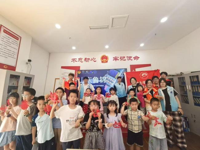 6月22日,實踐隊首站來到山東煙臺祥隆社區黨群服務中心,參與“剪刻黃河紋樣・傳承非遺匠心”青少年手工剪紙體驗活動。隊員們以魯錦為核心展開宣講,詳細介紹了魯錦的起源,以及“魚眼長流水”“棗花紋”等經典紋樣的吉祥寓意,像“魚眼紋”象征著年年有余,“棗花紋”則代表著豐收。宣講結束后,隊員們指導孩子們用剪紙復刻魯錦紋樣,孩子們都十分專注地創作,有的努力還原魯錦的幾何紋路,有的大膽嘗試“迷魂陣”紋樣,在動手操作的過程中,切身感受到了魯錦文化的獨特魅力。