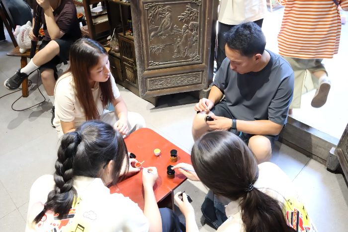 講解之余,吉伍五呷老師親自示范了彝族漆器制作的核心工序,將匠心具象呈現(xiàn)。從精選優(yōu)質(zhì)木材、精心制胎塑形,到繁復精細的髹漆,再到最后的紋樣描繪,每一步都是對匠人耐心與技藝的極致考驗。“單是髹漆這道工序,”吉伍老師一邊用特制的細毛刷均勻涂抹著天然漆料,一邊叮囑道,“就需要反復上七八層之多。每一層都必須置于特定環(huán)境中自然陰干,耗時數(shù)日,急不得,也馬虎不得。”漆器之美,正是在這時間的沉淀與匠心的堅守中悄然綻放。