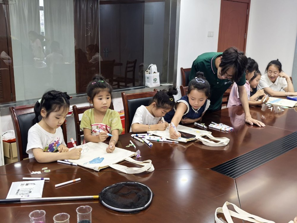 (圖為孩子們在帆布袋上畫她們心目中的綠色地球。 蔣超 供圖)