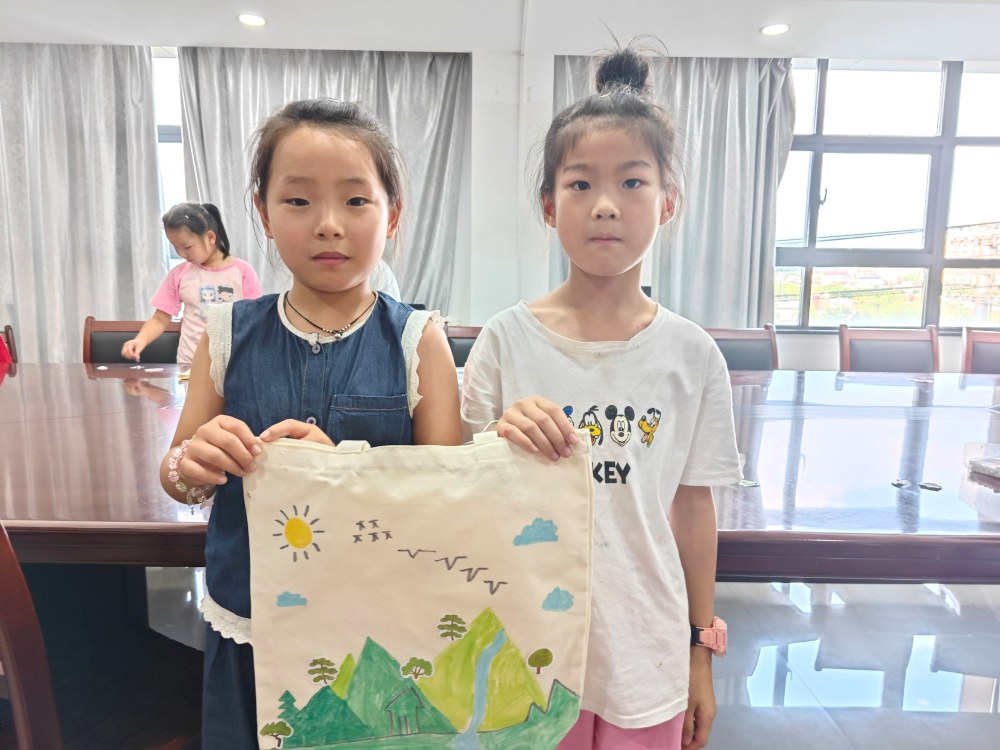 (圖為孩子們在展示帆布袋上的圖畫。馬孟璇 供圖)