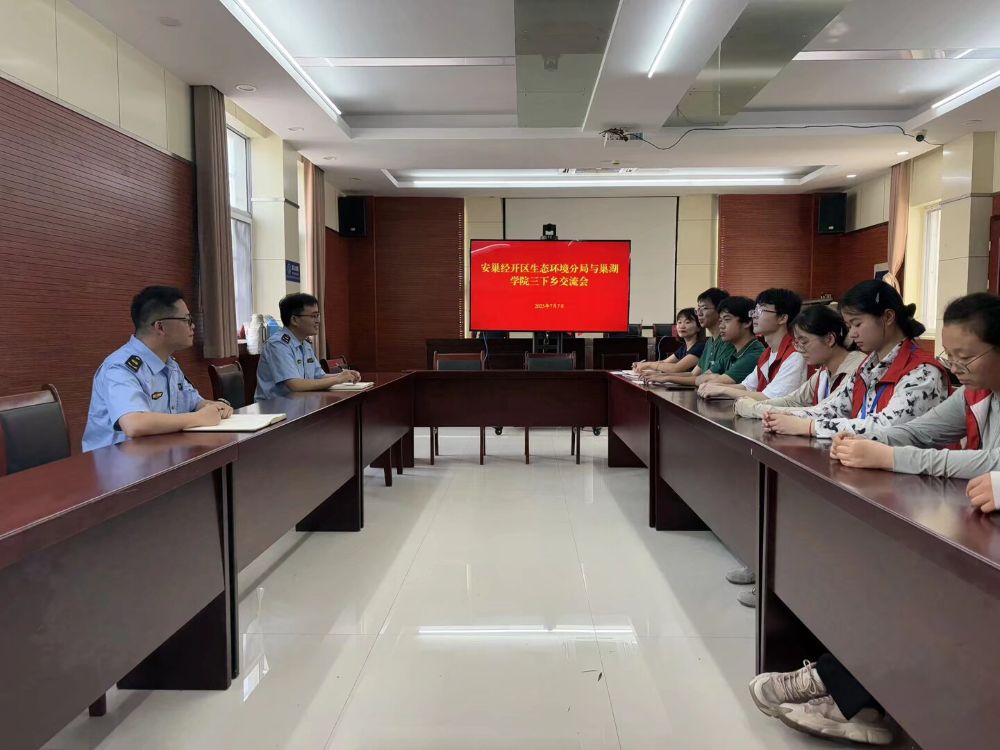 (圖為指導老師帶隊與安巢經開區生態環境分局工作人員交流巢湖環境問題。王煦然 供圖)