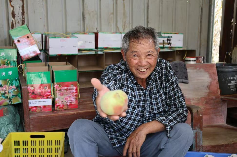 圖為果農爺爺展示鷹嘴桃(羅鈺婷供圖)