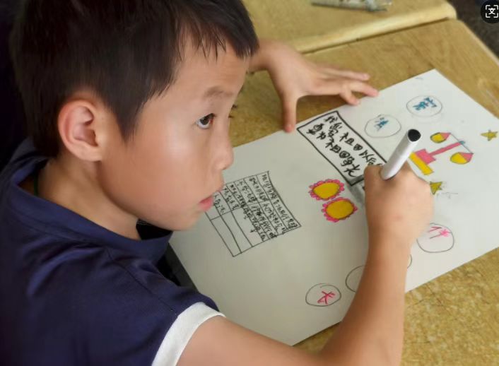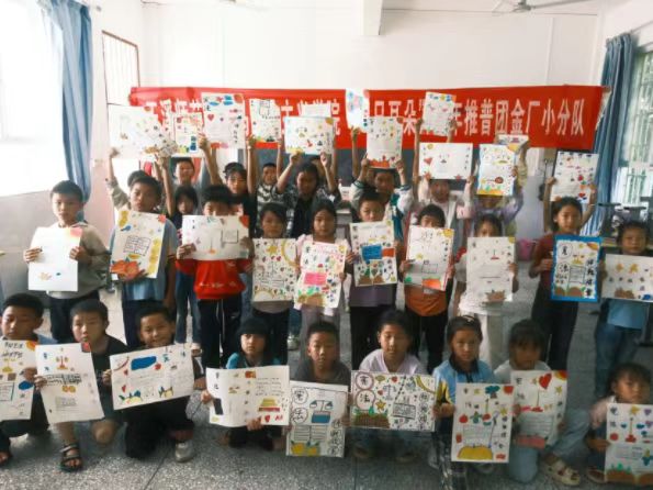 活動創新融入法治教育元素,推普團成員指導學生以普通話為媒介,圍繞《未成年人保護法》設計法治主題海報。“禁止校園欺凌”“我的權利我保護”……孩子們用彩筆勾勒出對法律的理解,團隊成員則結合語言規范,逐句講解法律條文。“用普通話講法律,既鍛煉了表達能力,又讓法治觀念深入人心。”推普團成員李娜說道。