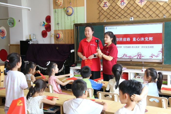 走進(jìn)恒大康樂幼兒園,宣講團(tuán)成員為學(xué)齡前兒童精心準(zhǔn)備了紅色故事分享,用生動形象的語言講述小英雄的故事;帶領(lǐng)孩子們傳唱紅色歌曲,稚嫩的歌聲中充滿了對英雄的崇敬;還開展了紅色繪本閱讀活動,通過色彩鮮明的圖畫,讓孩子們在潛移默化中感受紅色文化的魅力,在心中播下紅色的種子。