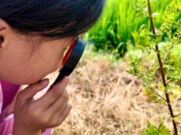 圖為學生手持放大鏡觀察植物 張慧敏攝。