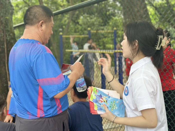 在南湖公園的綠蔭小道上,一抹青春的身影格外亮眼。“非遺傳承社會實踐團”的隊員們支起攤位,一場接地氣、有溫度的資助政策宣講活動正熱鬧開展。沒有復(fù)雜的宣講臺、精細的設(shè)備,幾張桌子、一疊疊宣講手冊,就是實踐團隊的“宣傳陣地”。本地人王奕琦同學(xué),她熟練地用客家方言與路過的阿伯阿婆拉家常:“阿伯,您屋企有細佬哥讀書嗎?國家有助學(xué)貸款,沒有利息噶,畢業(yè)之后正使還,唔使驚供唔起書!”她一邊說,一邊指著宣傳冊上的關(guān)鍵信息與其反復(fù)解釋政策相關(guān)內(nèi)容。她用親切的鄉(xiāng)音和樸實的講解,拉近了政策與村民的距離。