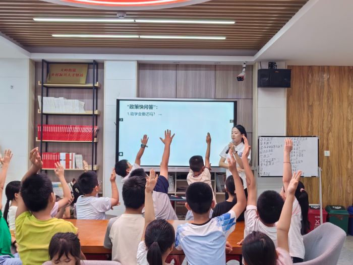 實踐團走進黨群服務(wù)中心課堂,為不同年齡段的孩子量身定制宣講活動。面對低年級的學(xué)生,楊躍同學(xué)化身“政策故事姐姐”,她利用生動的動畫和趣味問答游戲講解政策:“小朋友們,助學(xué)金需要還嗎?助學(xué)貸款什么時候還?翻一翻宣傳手冊看有沒有答案。”對中高年級的學(xué)生,盧小婷同學(xué)則組織深度答疑:“對于這位同學(xué)問‘貸款會不會難還?’其實國家設(shè)置了很長的寬限期......”她深入淺出的解答,讓“知識改變命運”的信念更深入人心。