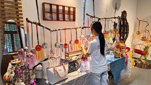 11日上午,團隊抵達素有“中國繡球之鄉”美譽的舊州古鎮。在國家級非物質文化遺產代表性項目傳承基地“繡蘊坊”,成員們被琳瑯滿目的精美繡球所吸引。傳承基地內,傳承人向團隊介紹了繡球背后的文化底蘊與手工技藝,團隊成員都為眼前琳瑯滿目、精巧絕倫的各式繡球而驚嘆。這里不僅有主色為“紅、藍、黃、綠”的經典款繡球,還有融合壯錦元素、草本植物等多種元素的新興款繡球。傳承人向大家展示了繡蘊坊為全國首屆學青會、歷屆東盟博覽會設計的定制款繡球,作為一項擁有800多年歷史的技藝,在與現代元素結合下,繡球得以煥發了別樣的光彩。“這些紋樣不僅僅是裝飾,更是壯族千百年來的文化記憶。”繡球制作技藝傳承人向團隊成員展示著手中的半成品,成員們仔細觀察繡球圖案,嘗試解讀其中可能隱含的地域符號,感受這指尖技藝如何將地名文化具象化、藝術化。