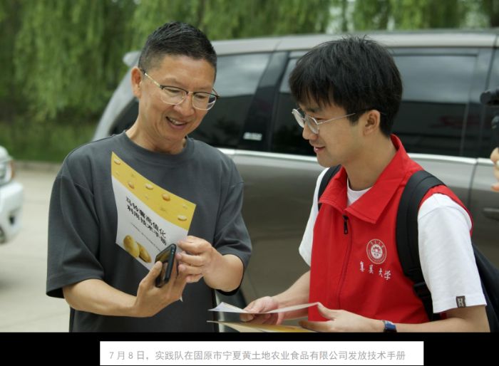 依托學校在酶制劑技術領域的優勢,實踐隊聚焦生物制劑、馬鈴薯加工及藥食同源中草藥三大領域,精準破解當地農業技術難題。在中衛市寧夏乙征生物工程有限公司,實踐隊與企業圍繞微生物發酵技術展開深度對話,讓理論與實操無縫銜接;在隆德縣閩寧協作產業園及果蔬種植基地,實踐隊詳細了解紫甘藍、番茄、馬鈴薯等農產品的種植環境與技術要點,并針對“馬鈴薯淀粉利用率低”這一痛點現場“把脈開方”,送上《馬鈴薯高值化利用》技術指南;在涇源縣六盤山鎮中藥材種植有限公司,實踐隊在聽取了企業負責人講解后,對中藥材精深加工、提升產業效益等問題“建言獻策”。調研全程,隊員們隨身攜帶的筆記本上,密密麻麻記滿了給企業和農戶的技術小貼士,字里行間都是跨越山海的牽掛。農戶紛紛表示:“技術送到家門口,增收有了新盼頭。”