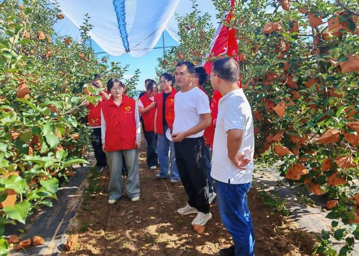 鏡頭前,實踐團成員手持紅潤飽滿的秦脆蘋果,細致講解“果型端正、甜度達16°”的獨特優勢;剝開鮮嫩的青皮核桃,演示“現剝現食”的清爽口感;更通過鏡頭帶領網友“云游”千畝果園,沉浸式展示有機肥種植、生態防蟲的現代農業魅力。實時互動中,網友們紛紛留言下單,直播間單場觀看量突破萬人次,為農產品打開了新銷路。田間地頭同步變身“實踐課堂”,宜君縣農技專家、祥裕蘋果專業合作社負責人任孝軍穿梭在果樹間傳經送寶,從春季修枝塑形的通風透光技巧,到夏季套袋防蟲的操作規范,再到秋季施肥抗寒的科學方法,將多年種植經驗毫無保留地傳授給實踐團成員們。大家手持筆記本穿梭林間,記錄要點、觀察差異,在實踐中掌握現代農業技術。