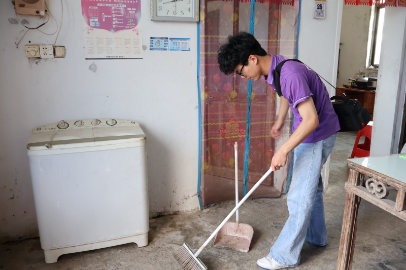(圖為7月14日,孫佳康同學(xué)為老人掃地。楊文軒供圖。)