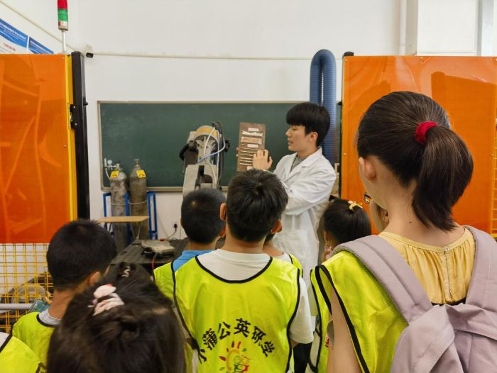 在材料科學(xué)與工程學(xué)院焊接實(shí)驗(yàn)室,志愿者為青少年們?cè)敿?xì)闡述了現(xiàn)代焊接技術(shù)在重大裝備制造中的關(guān)鍵作用,并逐一介紹了機(jī)器人協(xié)同焊接實(shí)驗(yàn)室、機(jī)器人自動(dòng)控制實(shí)驗(yàn),以及增材制造和摩擦焊等實(shí)驗(yàn)室。孩子們瞪大眼睛,認(rèn)真聽講,不時(shí)提問“機(jī)器人怎么精準(zhǔn)控制焊接位置”“不同材料焊接溫度一樣嗎”,對(duì)科技的好奇與向往溢于言表。