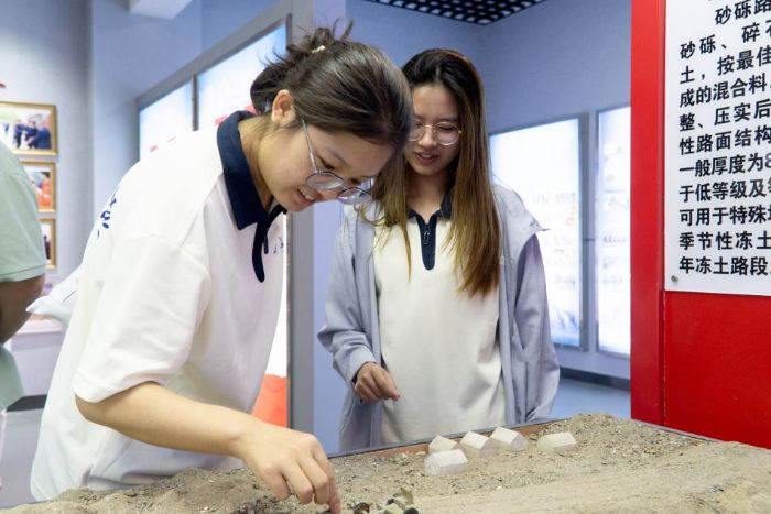 圖為實(shí)踐隊(duì)成員體驗(yàn)公路文化展示館沙盤模型