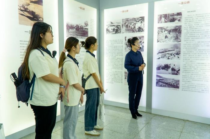圖為實(shí)踐隊(duì)聆聽講解員講解青藏公路紀(jì)念館“一條公路”主題展