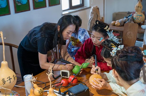 團隊重點走訪了福山當地非遺傳承人、老手藝人,與他們面對面交流,近距離感受傳統技藝的獨特魅力。在藤編老手藝人的家里,看著一根根普通的藤條在指尖變成精巧的籃筐,大家深刻體會到“經緯之間藏匠心”的內涵;實踐團隊通過沉浸式體驗巧果制作,直觀感受巧果模具的使用邏輯和背后的民俗文化;在愛與渡民宿工作室葫蘆烙畫傳承人劉偉老師的作品映入眼簾,細膩的線條與葫蘆的天然紋理相映成趣。隊員們親手體驗時,才發現控制烙筆的溫度與力度并非易事,更對傳承人的“火中取畫”技藝心生敬佩。