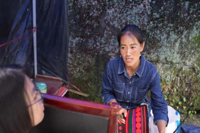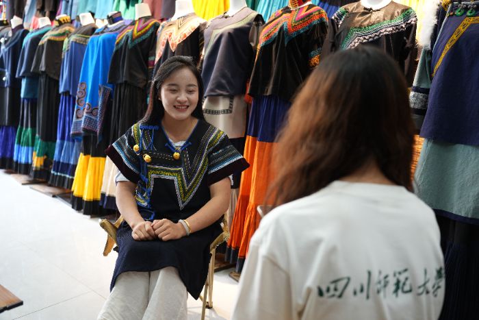 介紹完店內服裝后,阿克拉送接受了高叢莉的采訪,圍繞彝繡服裝的制作過程、銷售渠道、受眾群體及傳承現狀等話題展開交流。在采訪中她說,目前“彝色非遺”的銷售以線上渠道和服飾出租為主,因為線上市場空間更廣闊。近年來互聯網的發展,也讓越來越多各地區各族的年輕群體愛上彝繡服飾,這使得許多老舊彝繡衣物重煥生機。