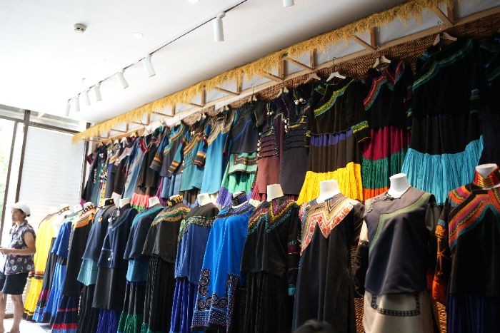 店鋪臨街區域,左右兩排著衣模特整齊陳列,后排貨架上層層疊疊掛滿風格各異的彝繡服裝;再往里走,則是琳瑯滿目的耳飾、頭飾等飾品區。