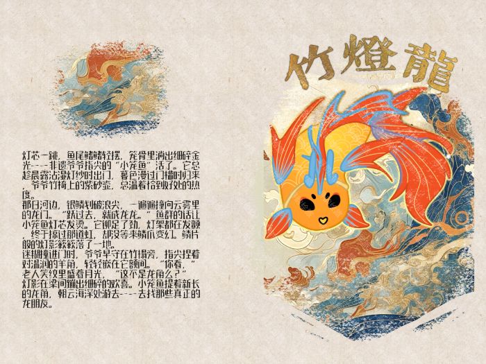 團隊以“小籠魚”這一生動有趣的IP形象為載體,將非遺文化與現代審美相結合,打造了一系列具有鮮明特色和高度辨識度的文創產品。團隊以“小籠魚”為主體創作繪本,講述了“小籠魚”在非遺爺爺呵護下突破自我、點亮水鄉的故事。繪本中“燈芯一跳,魚尾鰭鰭輕擺”的意象,既還原魚燈制作的工匠精神,又傳遞了“平凡亦可成光”的勵志內核。