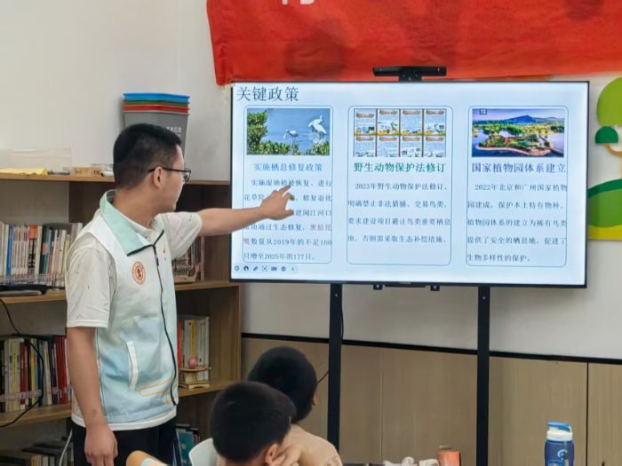 短暫的課間休息后,“鳥類保護”小課堂生動開講。志愿者陳永亮通過一幅幅色彩斑斕的圖片展示和一個個妙趣橫生的互動問答,帶領小朋友們走進了一個豐富多彩的鳥類世界。孩子們認識了多種珍稀鳥類,了解了它們的生活習性和生存現狀,也深刻認識到了保護鳥類棲息地的重要性。