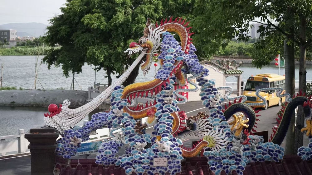 作為國家級非物質文化遺產,嵌瓷以“碎瓷為料、磚石為基”,匠人將專門燒制的瓷片敲碎、分類,再以水泥石灰黏合,在屋頂、墻體上拼貼出龍鳳、花鳥、人物等立體圖案。瓷片的堅硬耐腐賦予它 “百年不謝” 的生命力,而拼接的巧思又讓它兼具雕塑的靈動,堪稱 “剛柔并濟” 的民間瑰寶。在大寮嵌瓷工藝社,第四代傳承人許少鵬先生現場演示 “塑胚胎 - 剪瓷片 - 鑲嵌 - 上色” 的完整工序。成員們親身體驗時發現,看似簡單的剪瓷片需精確控制力度,鑲嵌時更要兼顧色彩過渡與造型張力。團隊通過高清鏡頭記錄下“雙龍戲珠”、“水滸108好漢” 等作品,制作《瓷語巧嵌:大寮巷陌里的碎瓷匠心》專題短片,讓觀眾看懂嵌瓷里藏著的潮汕人對 “殘缺即圓滿” 的哲學藝術表達,以及匠人 “磨破千百片,方得一幀活”的堅守。