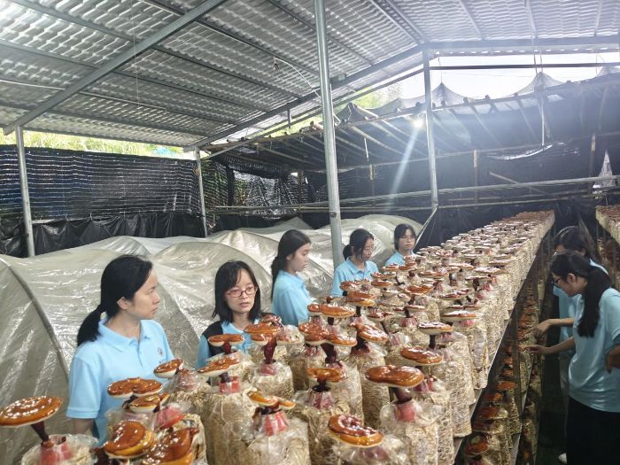 實踐隊員在靈芝培育基地學習袋料栽培種植技術,季星宇攝