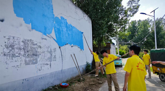 圖為實踐隊員為墻繪大面積打底 李珂 供圖