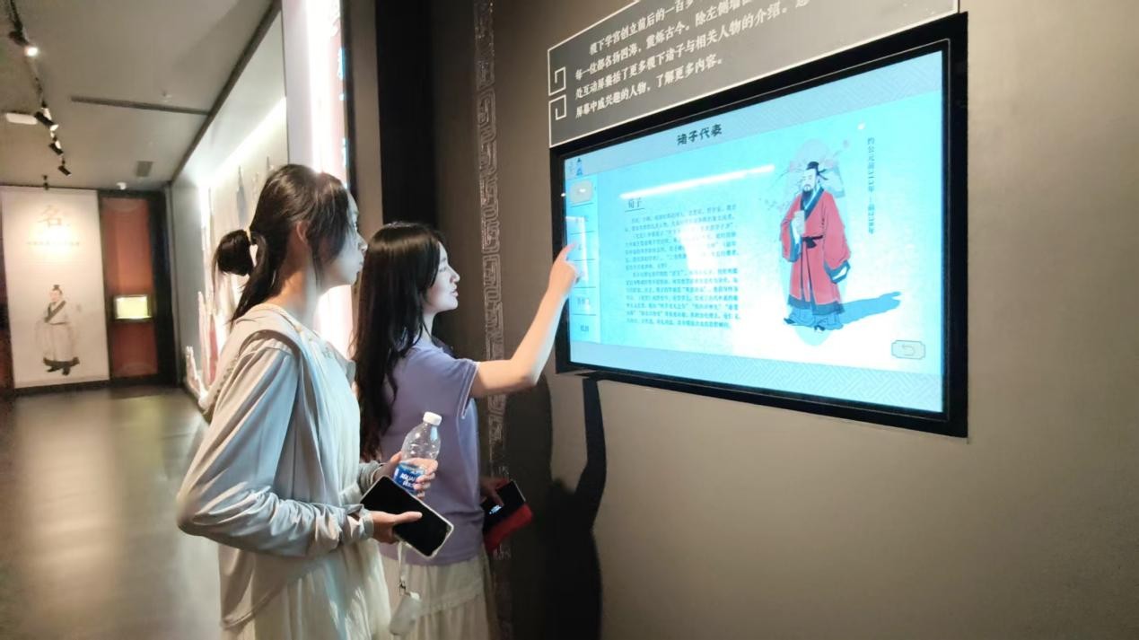 在“稷下講堂”互動展區,實踐團成員通過全息投影技術,沉浸式“親歷”孟子、淳于髡等學者圍繞“人性善惡”展開的激烈辯論,在虛擬與現實的交融中感受百家爭鳴的思想張力;隨后,大家換上曲裾、直裾等傳統漢服,在復刻的學宮講堂布景中,于案幾竹簡間效仿古人行禮誦讀,直觀體會“禮別異,樂和同”的禮樂文化與學宮人文氛圍;互動答題屏前,隊員們分組競答稷下學宮歷史、學派思想等題目,從“學宮始建諸侯國”到“白馬非馬論出處”,在搶答與討論中鞏固知識,深化對“開放包容、求真務實”學宮精神的認知。