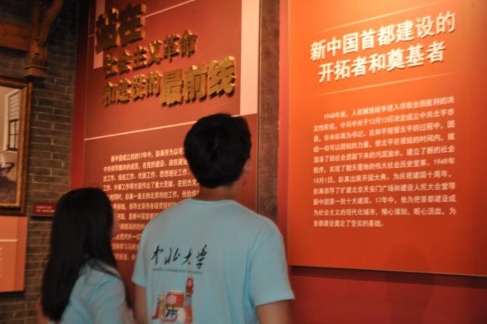 圖為實踐隊員認真查看彭真紀念館中的文字資料(蘭甜馨攝)