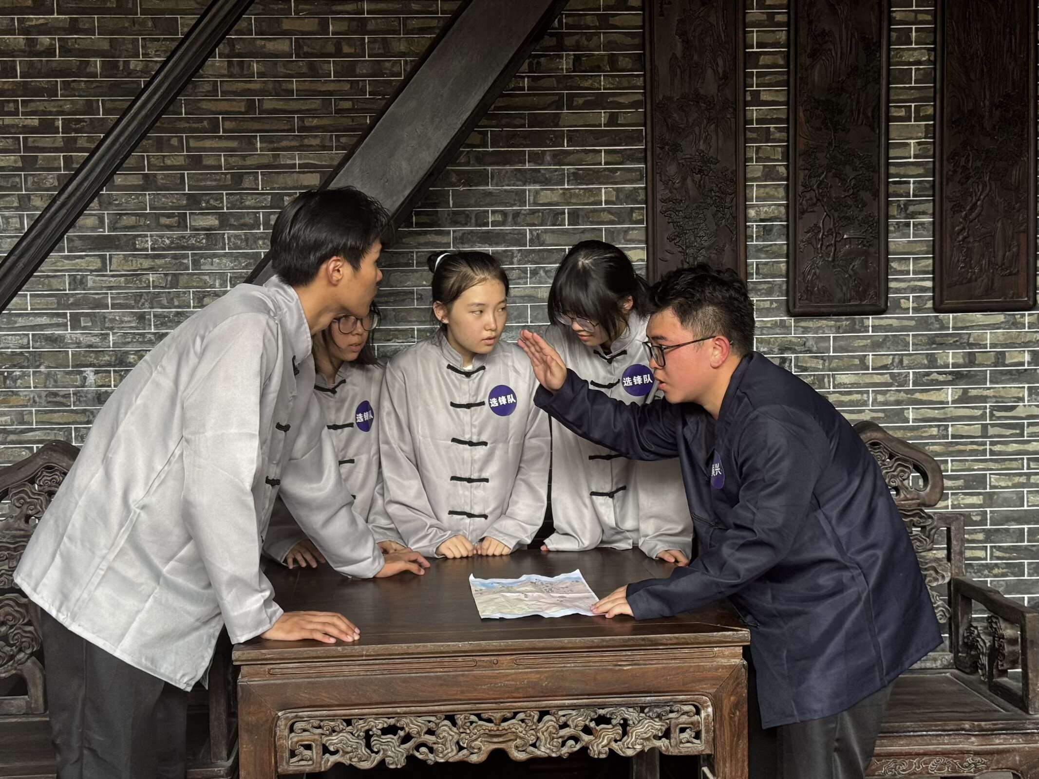 “黃興先生舉手示意大家安靜,指尖在地圖上慢慢劃過,停在一處,小聲低語:‘屆時,我們從此地出發(fā),兵分三路。我們合力攻打兩廣總督署。’徐維揚聽后點頭,輕聲應(yīng)道,‘明天,我們就這么干!’……”當(dāng)宣講同學(xué)魏汶莉講到,中國近代民主革命家黃興先生在革命期間曾多次到集之徐公祠后閣樓秘密商討起義事宜時,為生動再現(xiàn)兇險重重的起義行動和革命義士置生死于度外的英雄氣概,Young實踐團同學(xué)在祠堂內(nèi)進行了情景演繹。