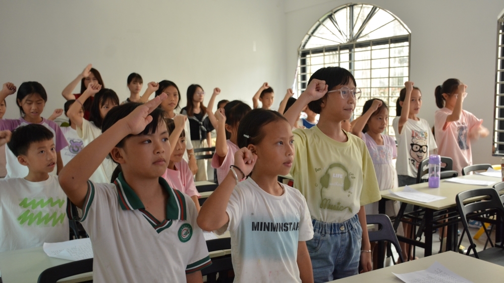 “老師,這些詞要如何有感情的進行朗誦呀?”12歲的馮金嫻舉著小手問。志愿者指著黑板上的歌詞:“要在每個詞語的地方進行停頓換氣并有感情的朗誦,特別是句子前面重后面輕。”她帶著學生一句句有節奏、有感情的進行朗誦,在朗誦期間結合趣味游戲進行邊朗誦邊玩的形式,讓學生在朗誦的過程中去感受先輩們的革命故事和精神。