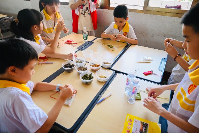 勞育:體驗勞動樂趣,觸摸非遺溫度 勞動教育與非遺傳承深度融合。陳慧琳老師的“指尖花趣香囊科普坊”非遺課程獨具特色。她引導孩子們探索紫蘇葉、廣藿香等植物香料的奧秘,采用“知識科普+香包制作”模式,讓孩子們在動手實踐中,既感知非遺魅力,又體驗勞動樂趣,收獲滿滿的實踐成果。