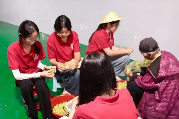 實踐過程中,實踐隊員們身著統一紅色隊服,來到農產品加工車間,實實在在地當起了"臨時工"。在生產車間,大家與當地工人協同作業,圍坐在堆成小山的白蓮旁,認真剝起白蓮,一顆顆仔細分揀,深入農產品加工一線。隊員們表示,親身參與農產品加工,不僅熟悉了農業產業的生產流程,更體會到農產品從田間到市場背后的辛勤付出 ,每一顆蓮子的品控要求都很嚴格,需要反復挑揀。