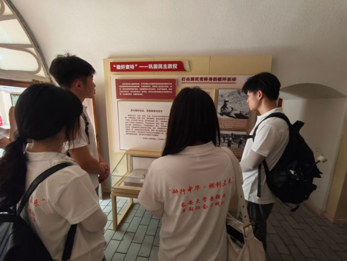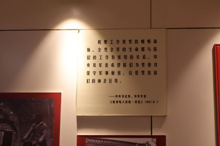 當日下午,實踐隊來到棗園西側的中央社會部舊址。作為黨的安全保衛(wèi)工作最高領導機構,中央社會部在復雜嚴峻的斗爭環(huán)境中,為保衛(wèi)黨中央安全運轉、為戰(zhàn)略決策提供情報支撐、對奪取抗日戰(zhàn)爭和解放戰(zhàn)爭勝利做出了特殊歷史貢獻。實踐隊員依次進入中央社會部一室、二室、三室等,駐足觀看展館內的照片、文字、情報復制品,進一步了解了其組織機構、框架與發(fā)展歷程,感悟隱蔽戰(zhàn)線工作中中國共產黨人的智慧與艱辛。