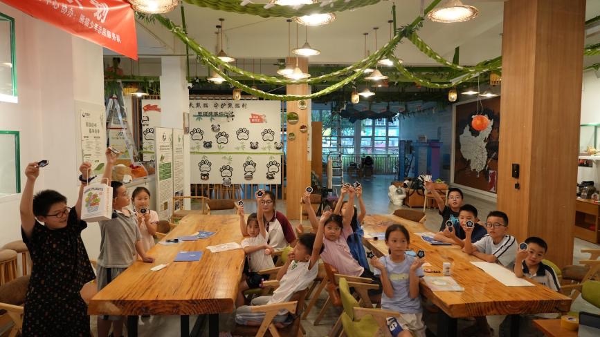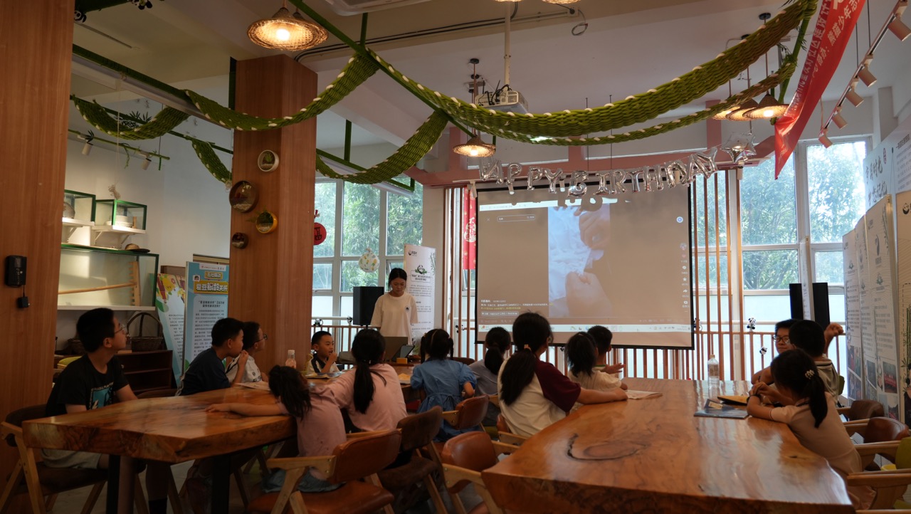 圖為志愿者播放扎染紀錄片) “為什么扎染圖案永遠不會重復(fù)?”面對孩子們的提問,志愿者用扎染制作工藝進行解釋——“折疊、捆扎、浸染,每一次手工的微小差異,都會創(chuàng)造出獨一無二的藝術(shù)。”