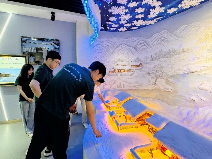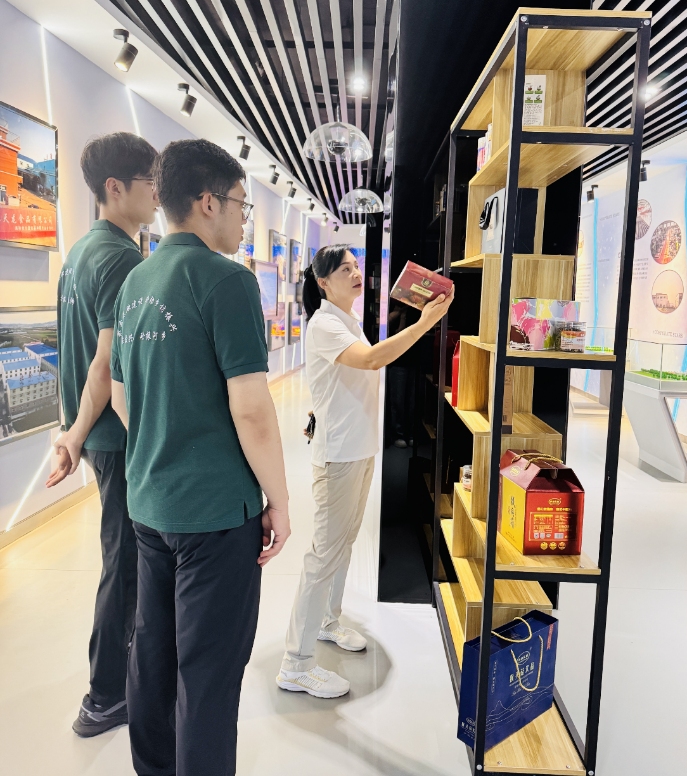 來(lái)到電子滾動(dòng)卷軸前,實(shí)踐隊(duì)成員隨著展卷節(jié)奏,細(xì)看關(guān)于海林森林資源、特色農(nóng)產(chǎn)品的介紹。“猴頭菇”、“黑木耳”等特色標(biāo)簽旁的注解,讓隊(duì)員們結(jié)合專業(yè)討論:“這些優(yōu)質(zhì)農(nóng)產(chǎn)要走出大山、特色木材要精深加工,交通物流的暢通與倉(cāng)儲(chǔ)設(shè)施的完善是關(guān)鍵支撐。”轉(zhuǎn)至園區(qū)風(fēng)采區(qū),屏幕上正播放智能菌菇生產(chǎn)線的忙碌場(chǎng)景,展架上陳列著特色農(nóng)產(chǎn)品的深加工制品。隊(duì)員們明晰:“從資源到產(chǎn)業(yè)的躍升,離不開(kāi)物流網(wǎng)絡(luò)的搭建與生產(chǎn)設(shè)施的優(yōu)化,這些正是土木交通專業(yè)可以發(fā)力的關(guān)鍵環(huán)節(jié),也是我們用專業(yè)能力為“好資源”蛻變?yōu)?ldquo;好產(chǎn)業(yè)”筑牢的支撐。”