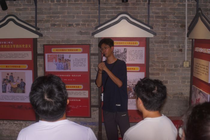 實踐團首先跟隨講解員陸朗然的腳步,來到江頭鄉農會舊址——朝谷陳公祠。這里是1924年廣寧首個鄉級農會成立之地,墻上工整的“農會會員守則”字里行間透著“為農謀利”的赤誠之心。凝視著“農會發展分布圖”,隊員們仿佛看到當年農會如星火燎原般發展壯大的壯闊景象。據講解員介紹,這一切離不開陳伯忠的不懈努力,他倡導的“兩講三操”訓練方法,將普通農民錘煉成具備強大戰斗力的農軍,為農民運動的推進奠定了堅實基礎。
