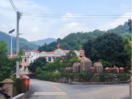 與金林水鄉的古樸厚重不同,官圩鎮沖源村以“酒香文化村”聞名。甫一進村,橙黃民居整齊排列,家家戶戶門前陳設著釀酒陶壇,墻上的“把酒話桑麻”“醉里乾坤大”等詩句,瞬間將人帶入濃郁的酒文化氛圍之中,宛如一處群山環抱的“酒香桃源”。
