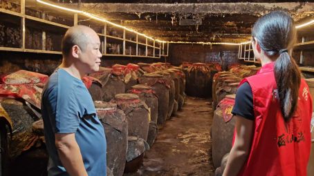 圖為三下鄉隊員與當地冼氏酒坊老板交談的照片。佛山大學醫暖山湖實踐團宣傳組攝