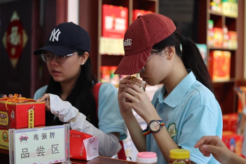踏入天等辣都形象店,實踐團成員便被豐富的辣椒產品吸引。在“兆強牌品嘗區”成員們駐足體驗,有的打開辣椒醬罐輕嗅香氣,有的拿起禮盒端詳包裝。展柜里,指天椒醬、泡指天椒、泡七彩椒等 20 余種“兆強牌”產品有序陳列,涵蓋調味、休閑食品等品類,直觀呈現當地辣椒產業深加工成果。