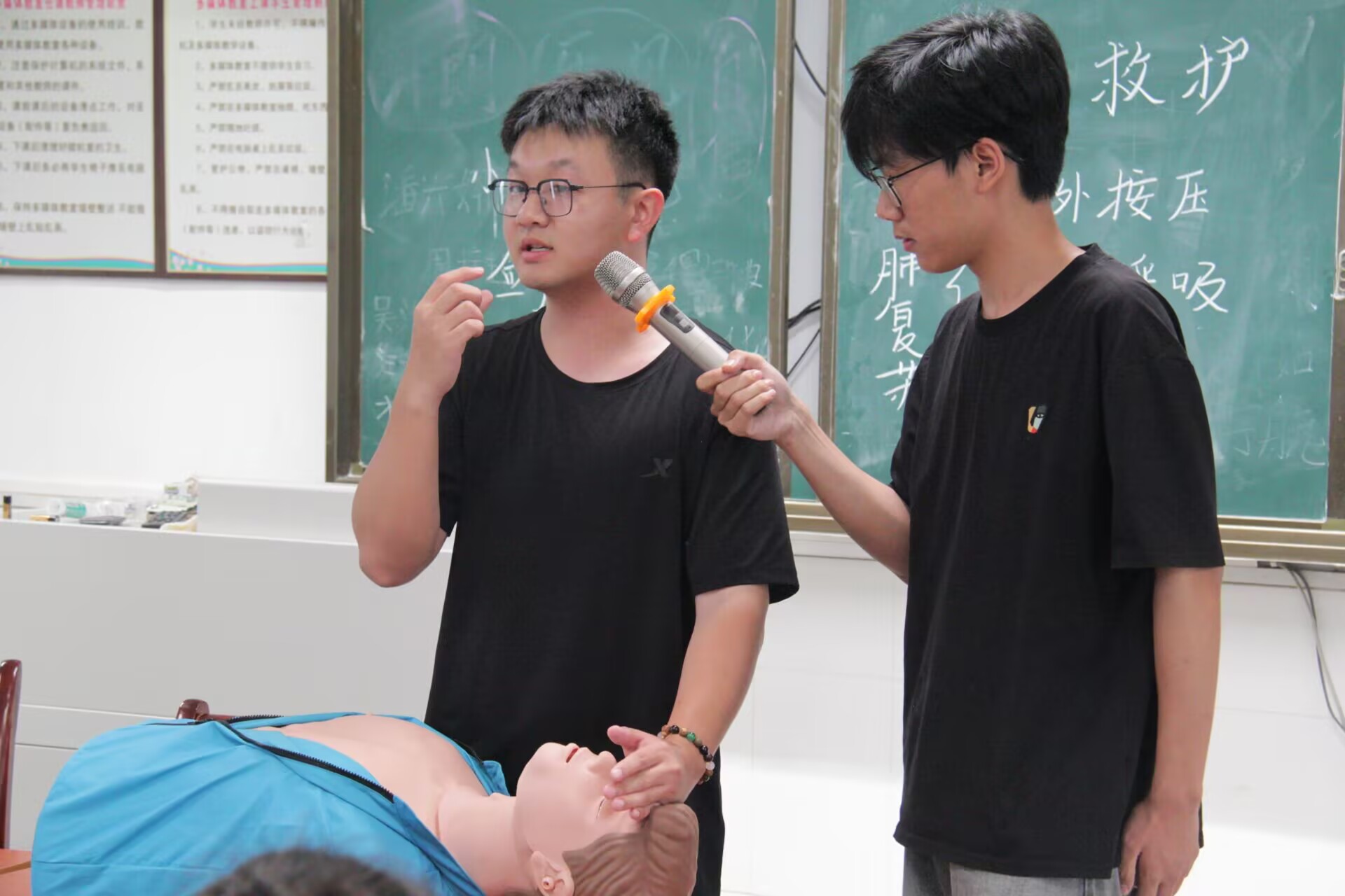 在核心技能教學環節,志愿者聚焦心肺復蘇術,詳細講解并演示操作規范:明確按壓部位為兩乳頭連線中點,按壓頻率需維持在每分鐘100-120次,按壓深度控制在5-6厘米;同時,分步演示判斷意識、呼叫救援、胸外按壓、開放氣道、人工呼吸等完整流程,確保學生掌握操作要點。