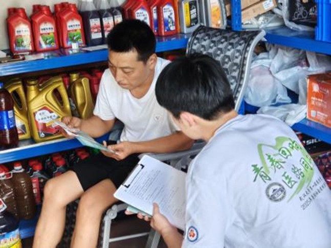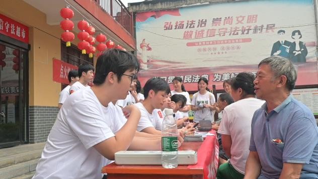 完成近20戶調研走訪后,實踐隊員們在黨員群眾服務中心前搭建了健康宣教義診點,分組為村民量血壓,測血糖,同時分發健康手冊并結合“全民減重”政策進行慢性病預防科普。“血壓135/85,稍微有點高,平時少喝點咸菜湯就行。”“血糖控制得不錯,記得按時吃降壓藥。”一句句接地氣地叮囑,把復雜的醫學知識化作日常提醒。那本密密麻麻的健康檔案,已悄然成為這座村莊未來精準幫扶的第一份“健康地圖”。