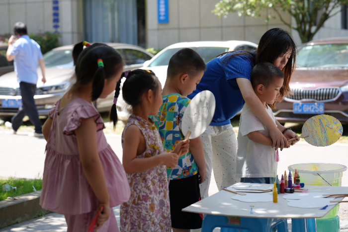 漆扇制作課上,實(shí)踐團(tuán)成員用PPT展示漆扇歷史后,孩子們圍站在桌前,用天然顏料在素白扇面上創(chuàng)作,將扇子放入水中,以點(diǎn)、甩、彈、劃等手法,在水面繪出圖案效果,再暈染在扇面,形成妙趣橫生、自然天成的圖案,每一把都是獨(dú)一無(wú)二的藝術(shù)品。“想畫(huà)四面山的瀑布,這樣不僅美觀,媽媽干活累了可以為她扇風(fēng)。”8歲的小朋友專(zhuān)注地給扇面涂著藍(lán)色,顏料沾到指尖也不在意。舉著晾干的作品說(shuō):“原來(lái)這就是非遺,真有趣。”