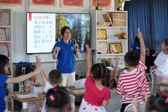 圖為實(shí)踐團(tuán)成員為孩子們科普四面山文化。龔由蕓 攝