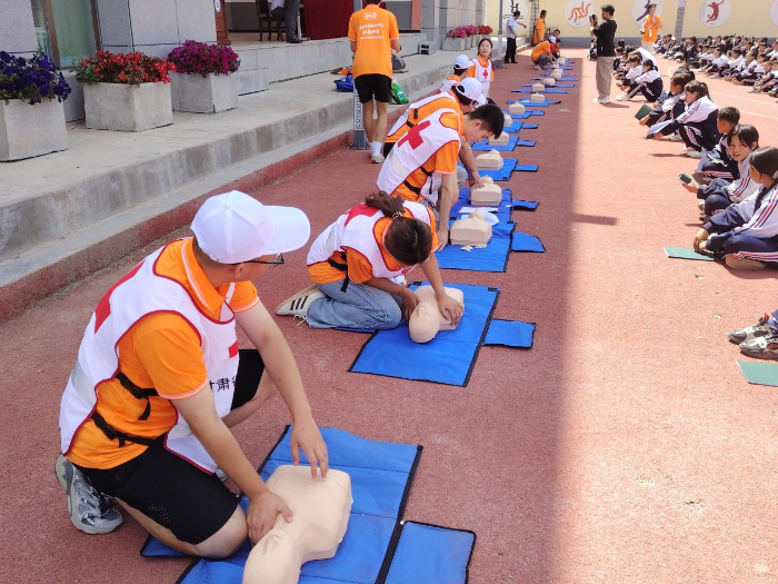 實(shí)操演練:手把手教學(xué),掌握救命技能講到心跳呼吸驟停心肺復(fù)蘇環(huán)節(jié),郭愛(ài)軍與王璐瑤兩位老師配合進(jìn)行了操作示范,從胸外按壓的深度、頻率到人工呼吸的動(dòng)作要領(lǐng),逐一細(xì)致講解。蘭州理工大學(xué)紅十字志愿服務(wù)隊(duì)的13名志愿者分組指導(dǎo),為師生們提供“手把手”教學(xué),及時(shí)糾正操作細(xì)節(jié),讓參與者都能掌握正確的急救方法。活動(dòng)現(xiàn)場(chǎng)互動(dòng)頻繁,師生們熱情高漲。