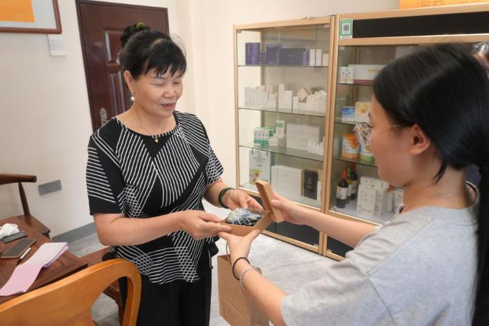 7月6日,實踐隊走進東山縣當地一家香囊制作小鋪,將藥學專業知識與實踐服務相結合。隊員們結合當地居民的生活習慣,精心挑選薰衣草、合歡花、石菖蒲等具有寧心安神功效的中藥材,按照科學配比制作成中藥助眠香囊。