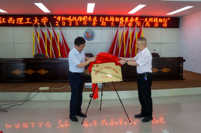 圖為江西理工大學徐志峰副書記(左)與盤古山鎢業鐘益民副總經理(右)共同為校企共建的‘大思政課’教學基地揭牌。