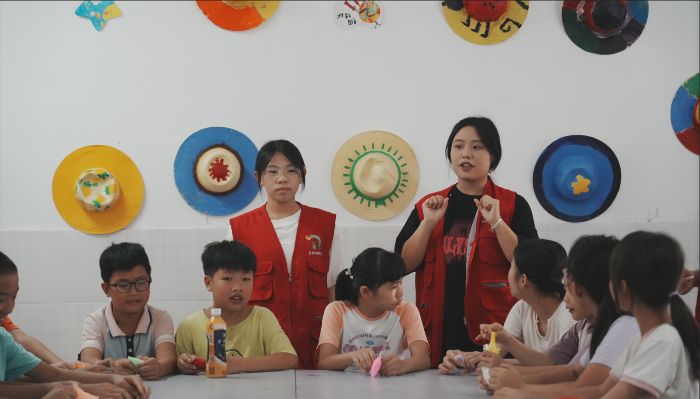 圖為服務(wù)隊(duì)成員教授手工創(chuàng)作技巧。供圖 吳雨聲