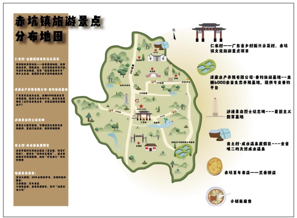 除了爆款文創、表情包等“軟輸出”,實踐隊帶來的《赤坑鎮手繪旅游地圖》更藏著硬核成果:隊員們頂著35℃高溫走遍赤坑鎮各個村落,用腳步丈量每寸土地,不僅梳理出仁家村、澤康水產養殖有限公司垂釣休閑基地等多個特色景點,更手繪出標注詳盡的景點分布圖,設計出“紅色研學線”“鄉村休閑線”等多條主題路線。赤坑鎮團委副書記莊欽雅在展區建議:“再多標注些本地美食!”隊員們當即手繪補充“小胡扁食”“蘭泰餅店”等美食地標,讓“紙上藍圖”真正成為村民和游客認可的“活指南”。